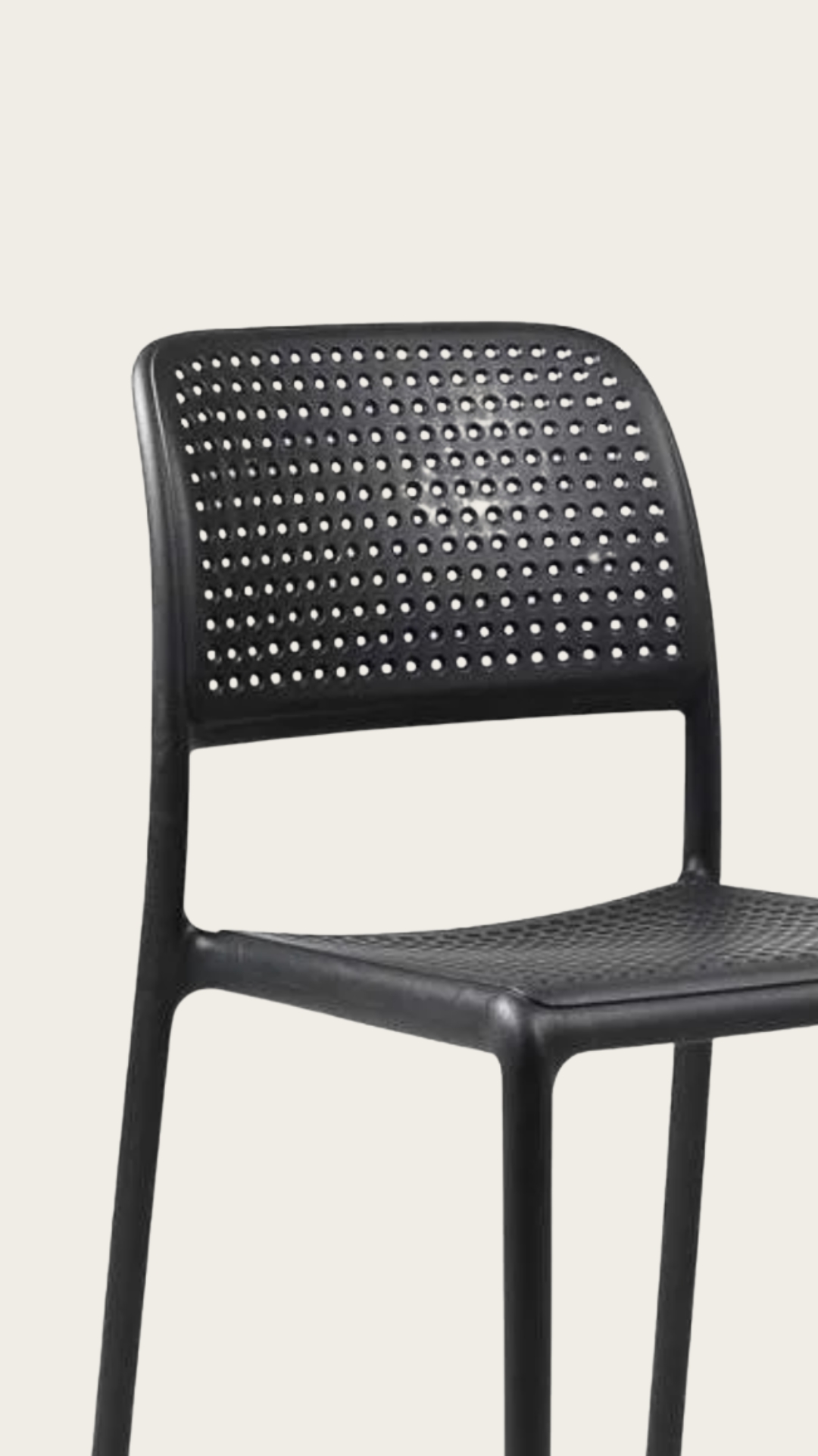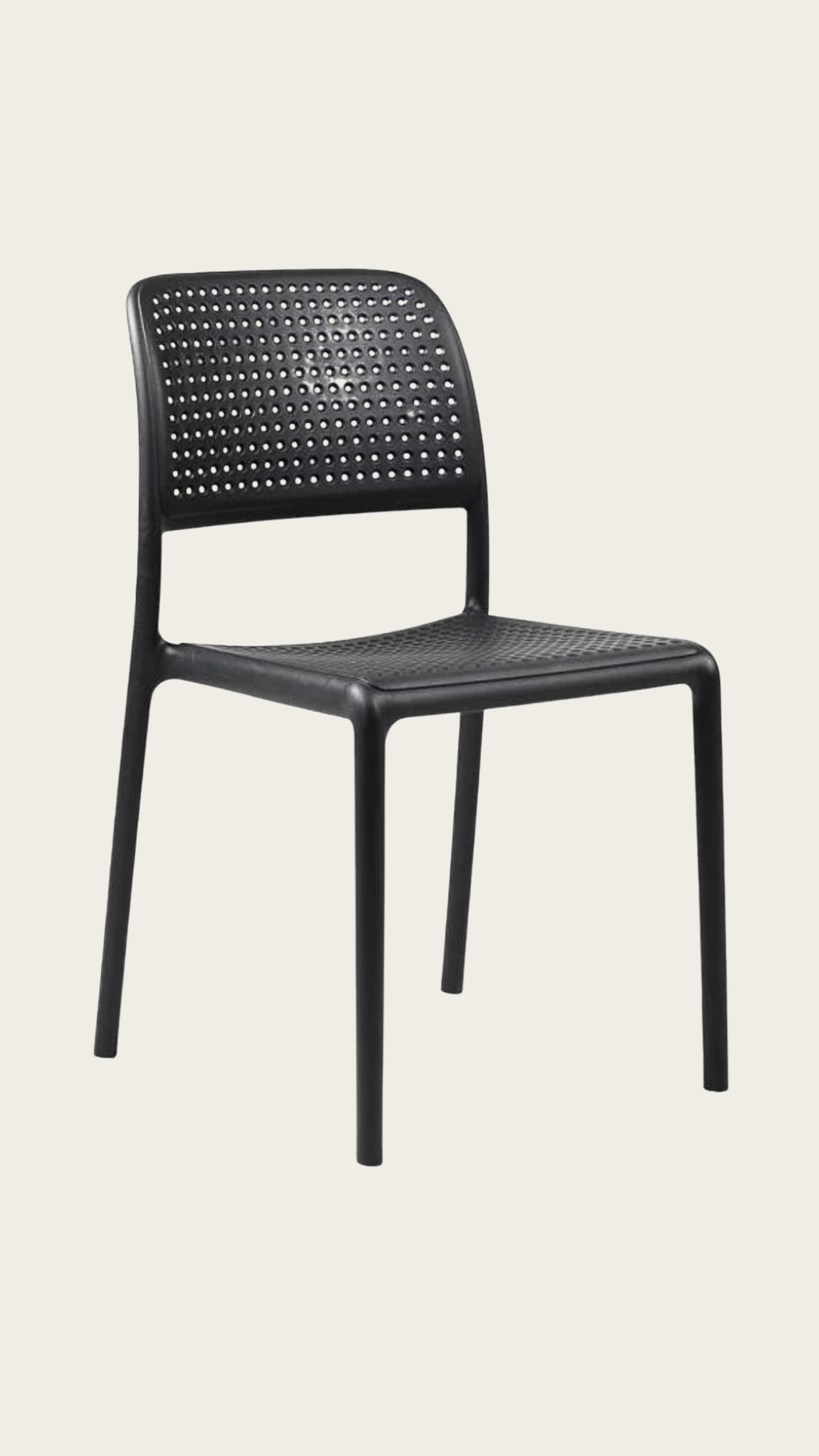 Detalhes técnicos: Cadeira monobloco sem braços. Material: resinas de polipropileno com fibra de vidro de cor uniforme e aditivos UV. Acabamento fosco. Com pés antiderrapantes. Resina reciclável. Produto empilhável.