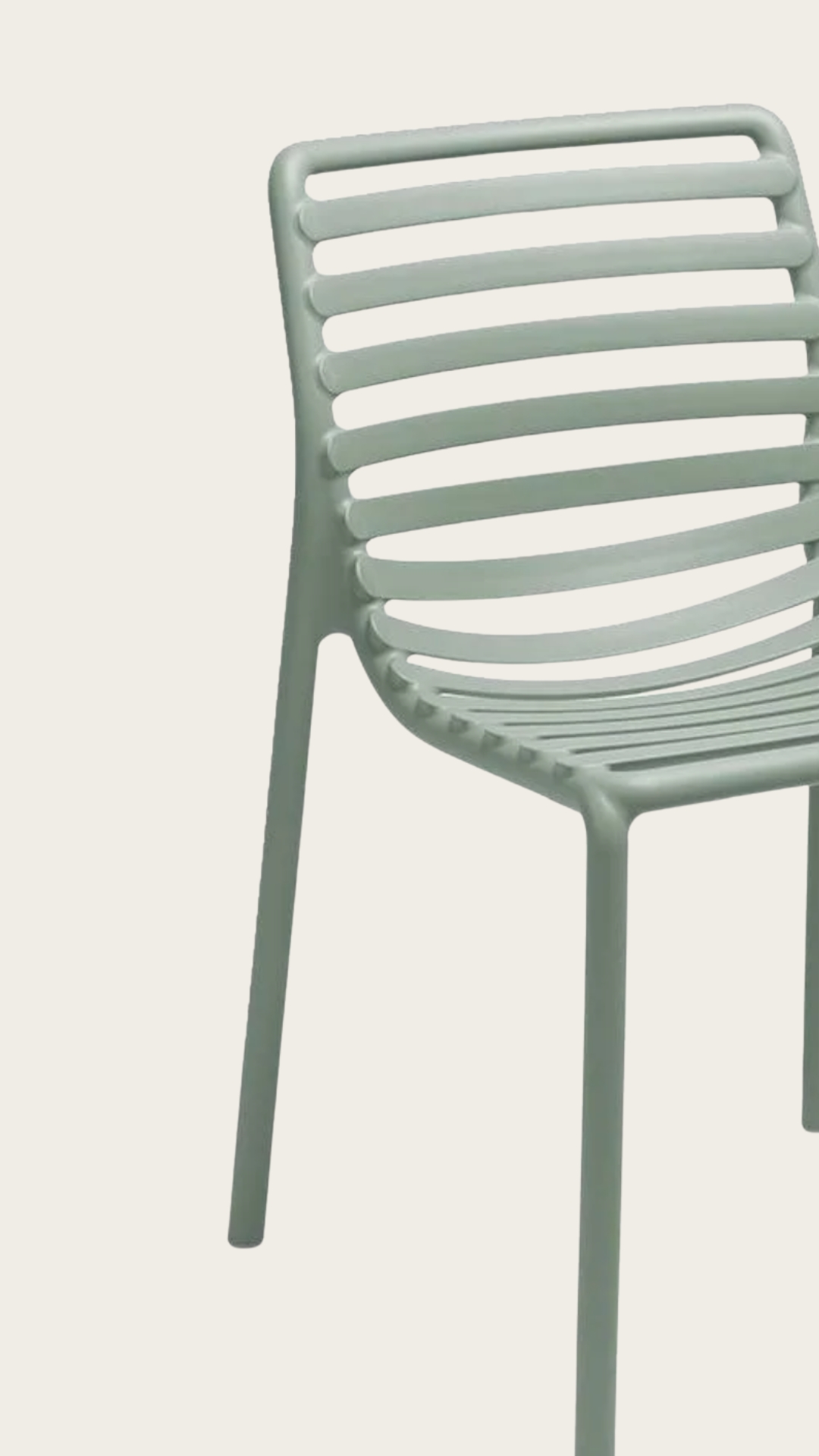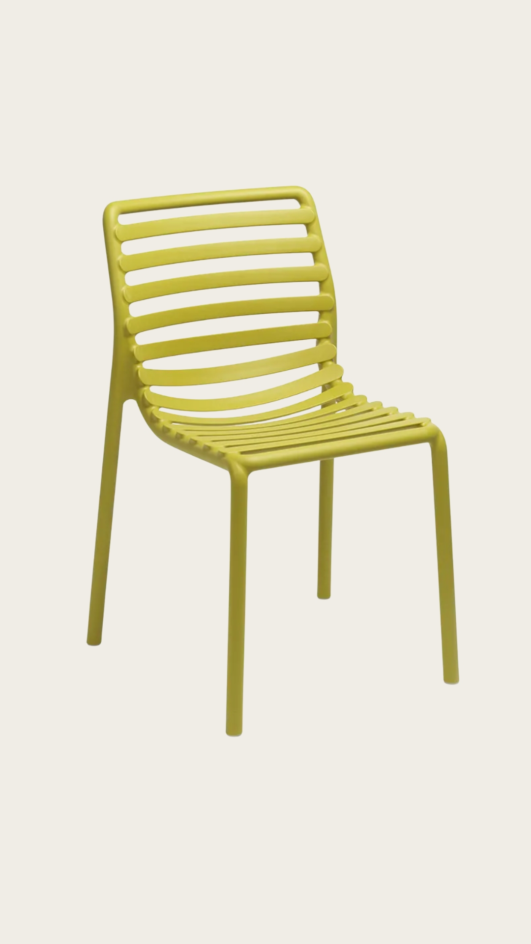 O design ripado confere um visual contemporâneo à cadeira Doga Bistrot, uma cadeira de exterior sem braços feita de resina de fibra de vidro. É prática para mover, empilhável, fácil de higienizar e totalmente reciclável.