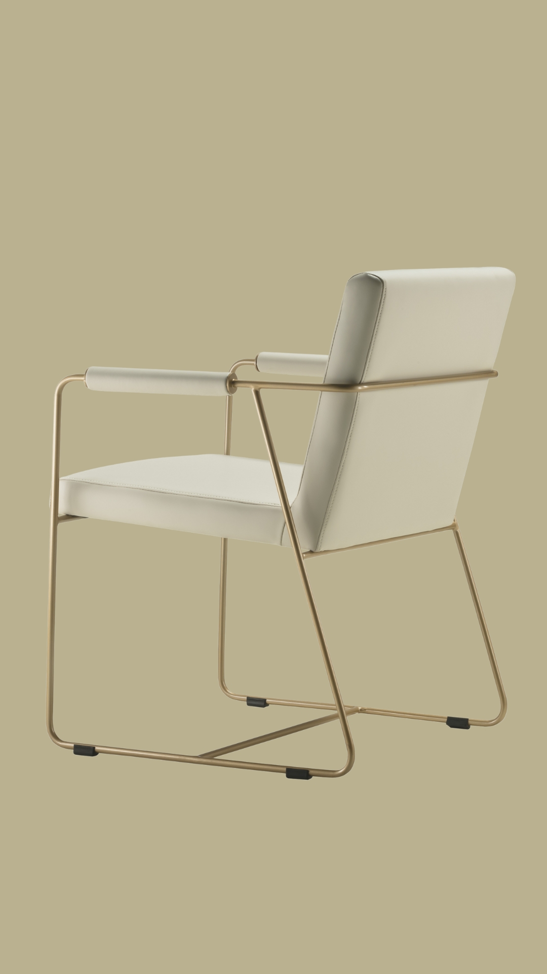 Cadeira com estrutura interna de madeira multilaminada de eucalipto totalmente estofada, estrutura de aço carbono pintado ou cromado.
