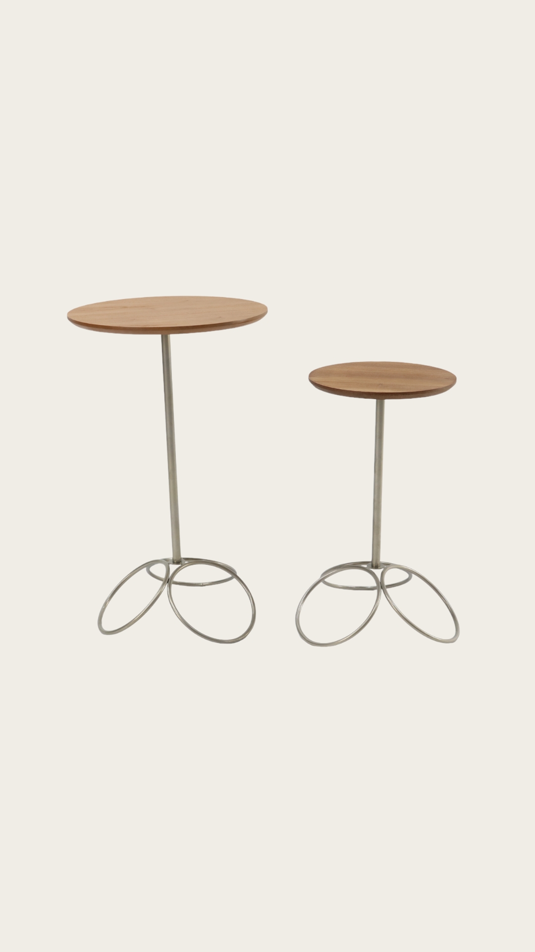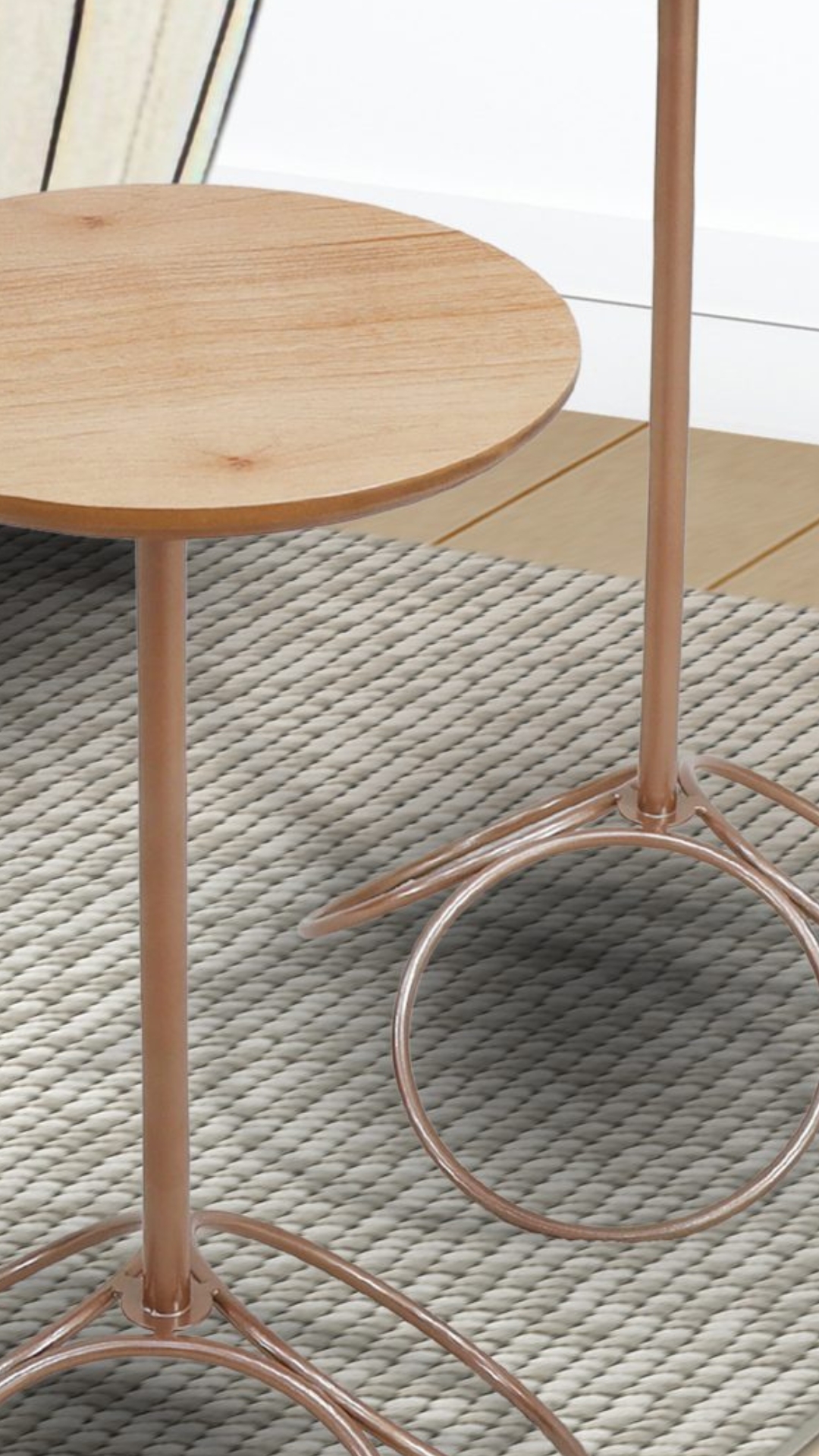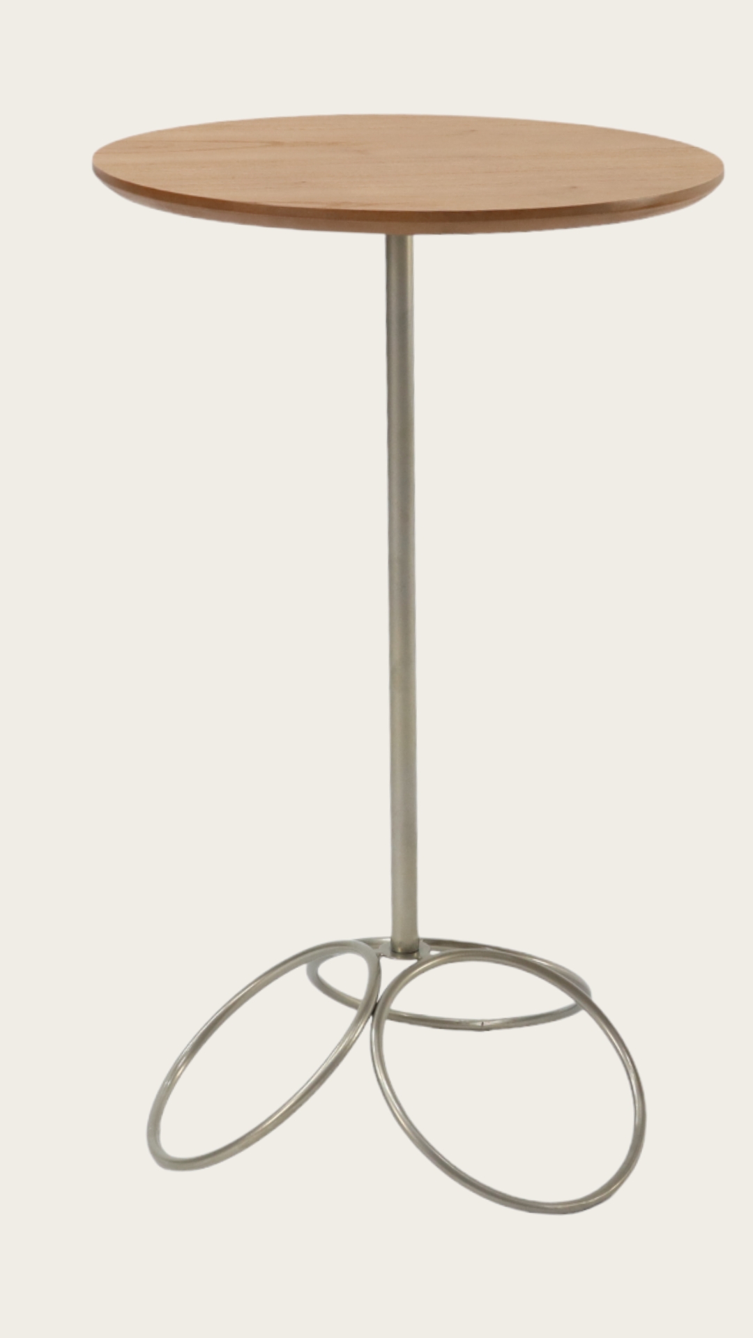 Tampo em MDF com lâmina em madeira de cinamomo, sua base em metal com pintura epóxi.