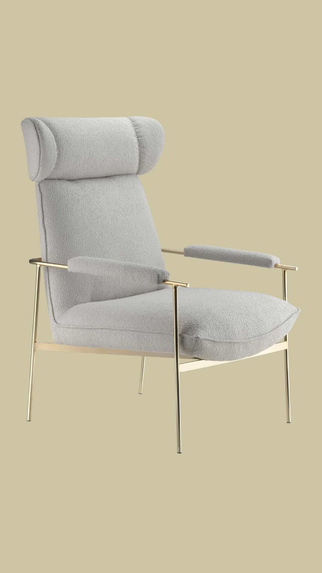 Poltrona com braço em aço carbono pintado, assento estofado e encosto em madeira.